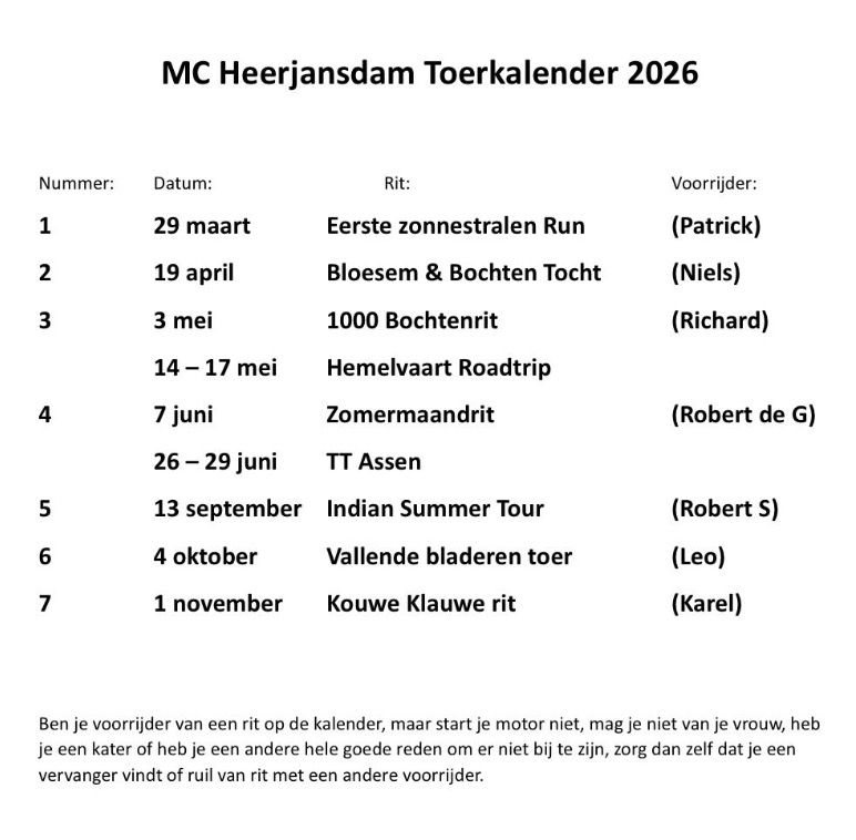 - Toerkalender 2026door John SchopDe toerkalender voor 2026 is gepubliceerd! Je kunt ‘m hier downloaden, of gewoon naar https://mcheerjansdam.nl/kalender/categorie/toerritten/ gaan en de laatste informatie bekijken.